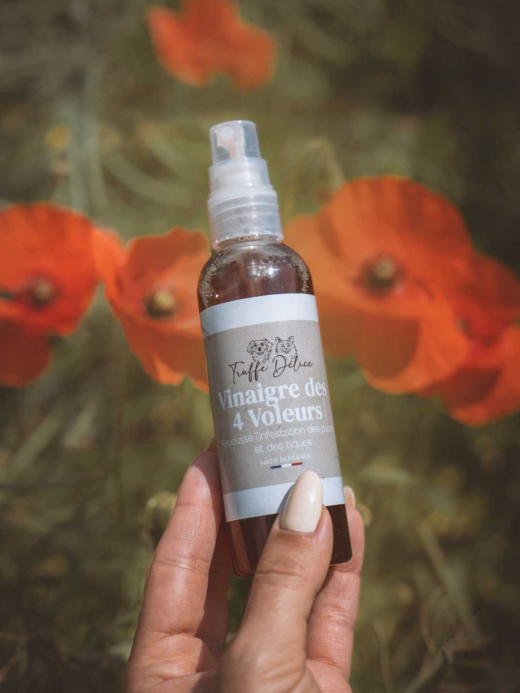 The Vinegar of the Four Thieves is a powerful natural repellent against ticks and fleas . This blend of ingeniously selected and measured plants is macerated in cider vinegar. The vinegar does not contain essential oil, so it is suitable for epileptic dogs and cats.
