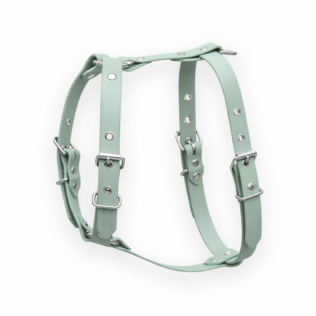Harnais pour chien en Biothane® vert sauge avec une bouclerie en acier inoxydable. Ce harnais est idéal pour les chiens qui aiment se salir, se baigner ou sauter dans les flaques de boue car il est waterproof et ultra résistant. C'est le harnais tous terrains qui traversera les années avec votre chien. Fabriqué à la main à Paris.