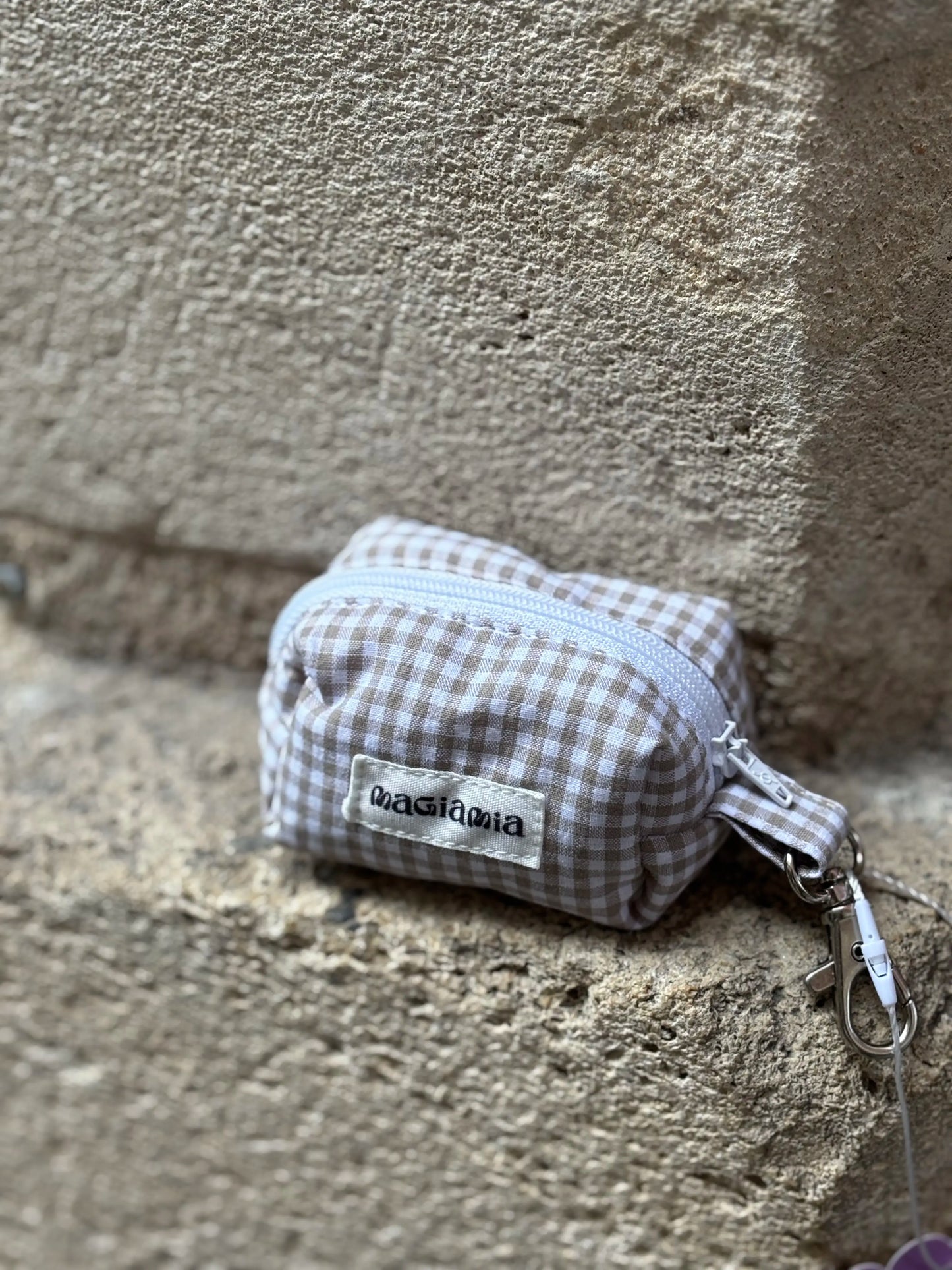Beige gingham cotton waste bag dispenser with silver inserts. Each bag has a carabiner for easy attachment to your leash, as well as a zippered opening for storing your waste bags.