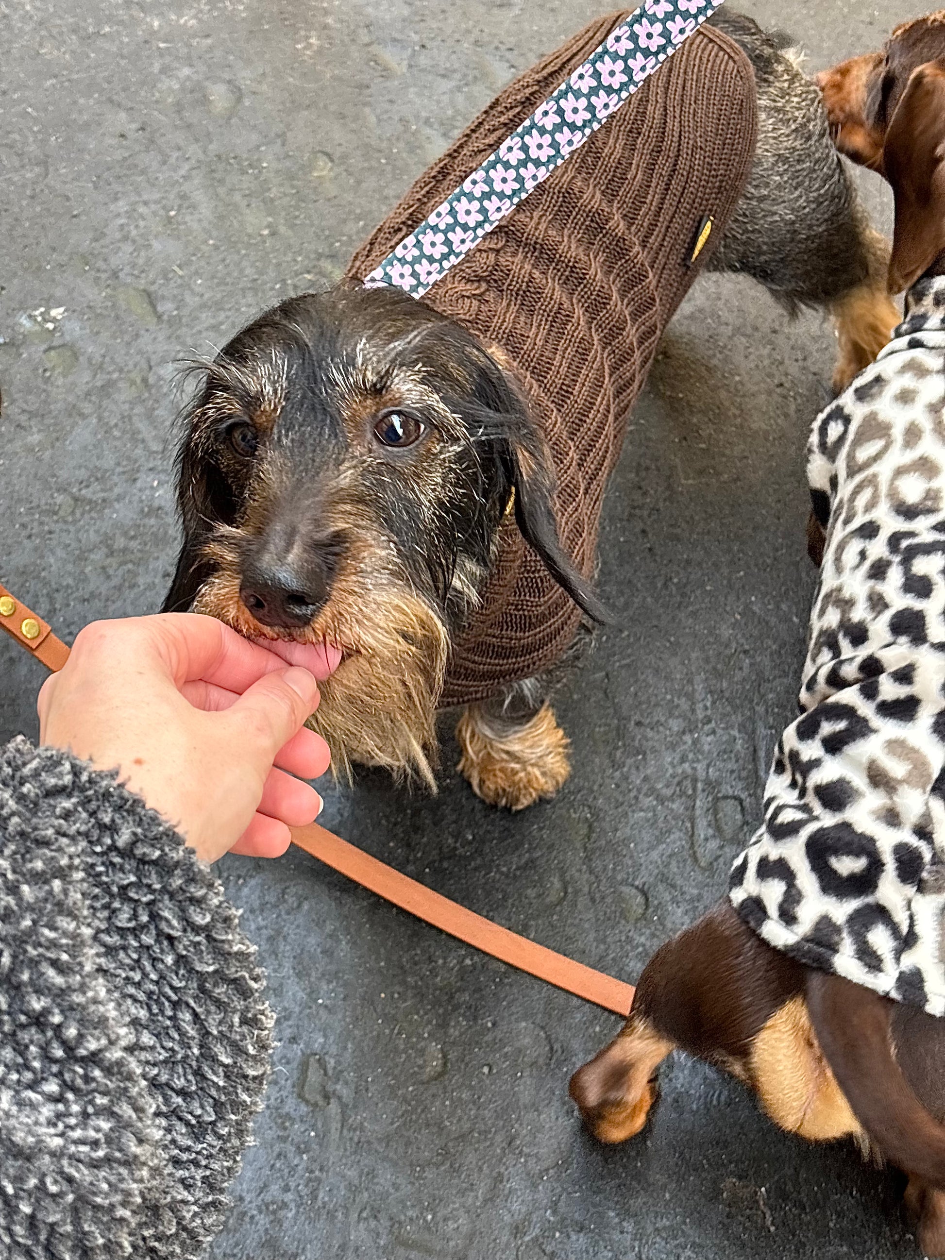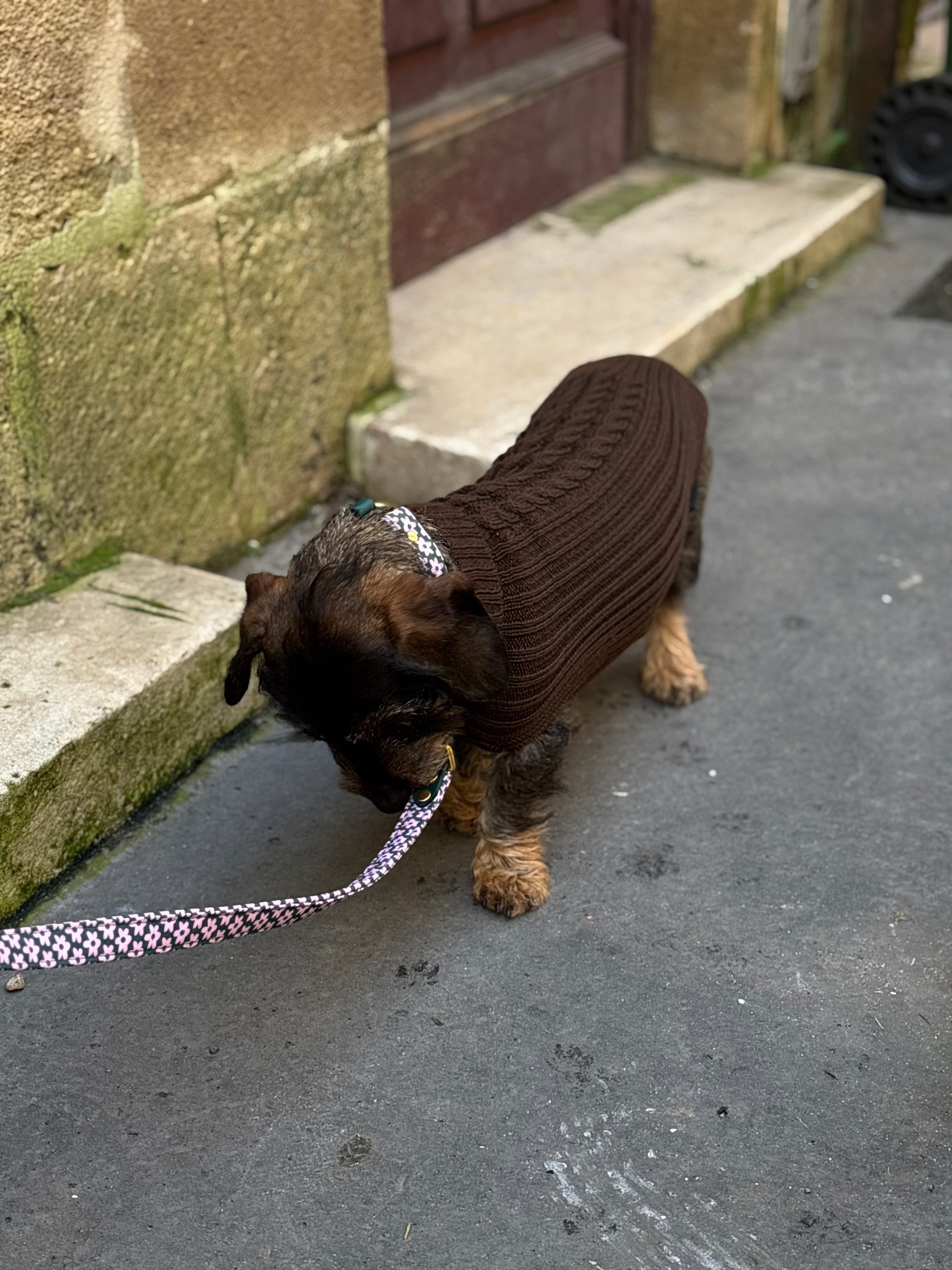 This brown knit sweater is designed to provide comfort and warmth for your dog in cold weather. It's a sleeveless sweater that hugs the dog's body, creating a "second skin" effect . It's perfect for autumn and winter, for walks or simply for lounging indoors when it's chilly.