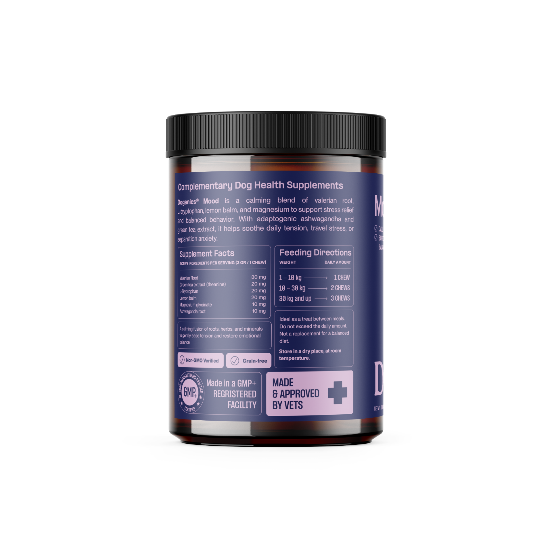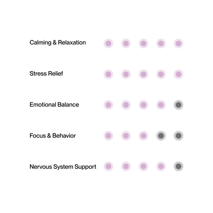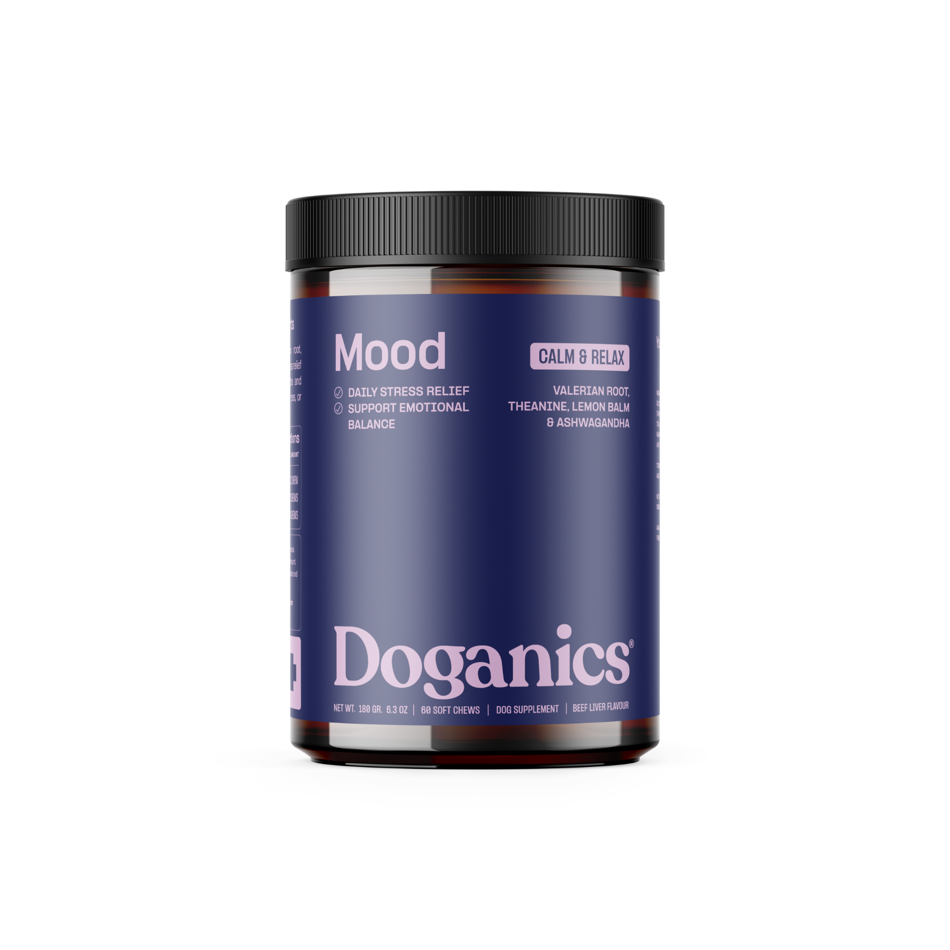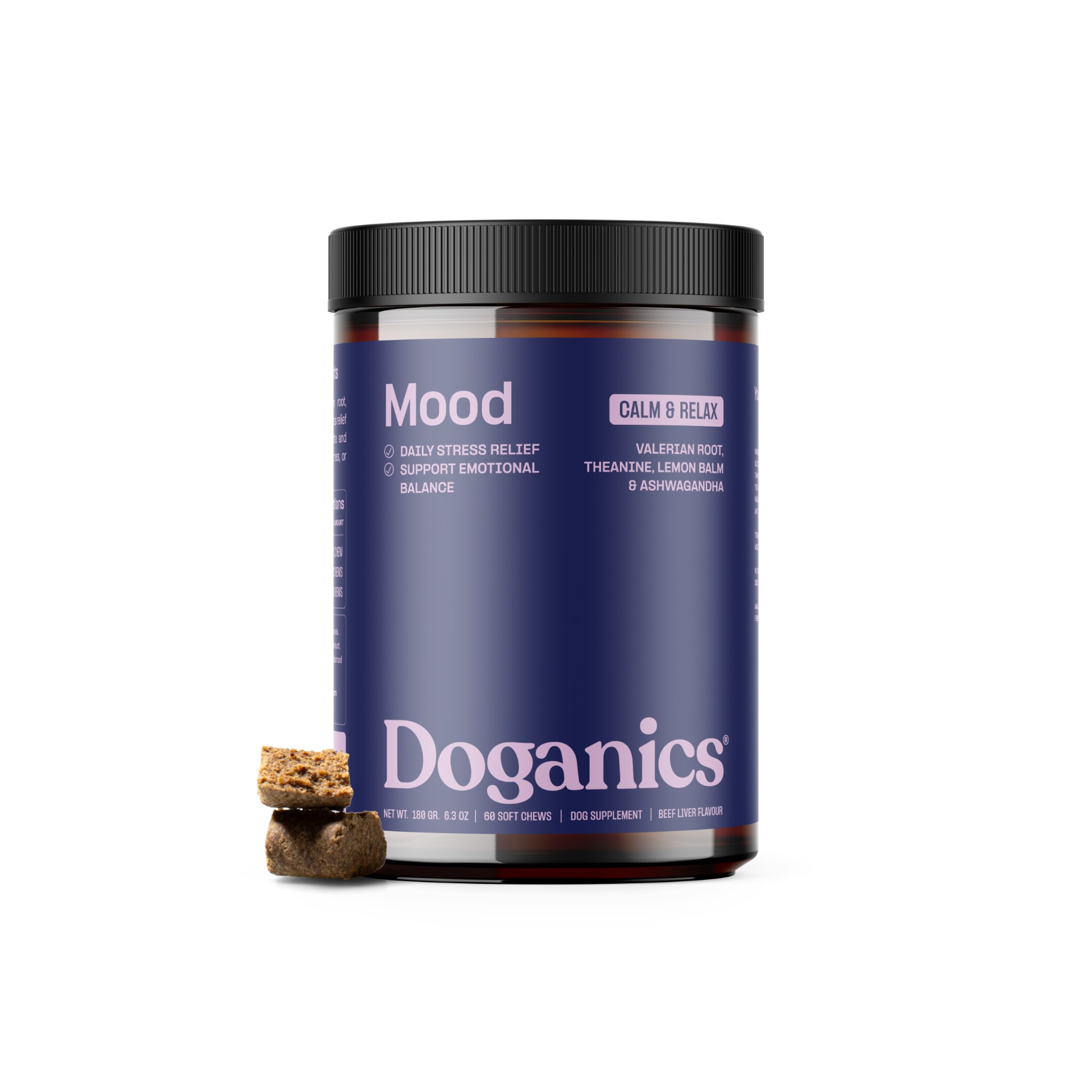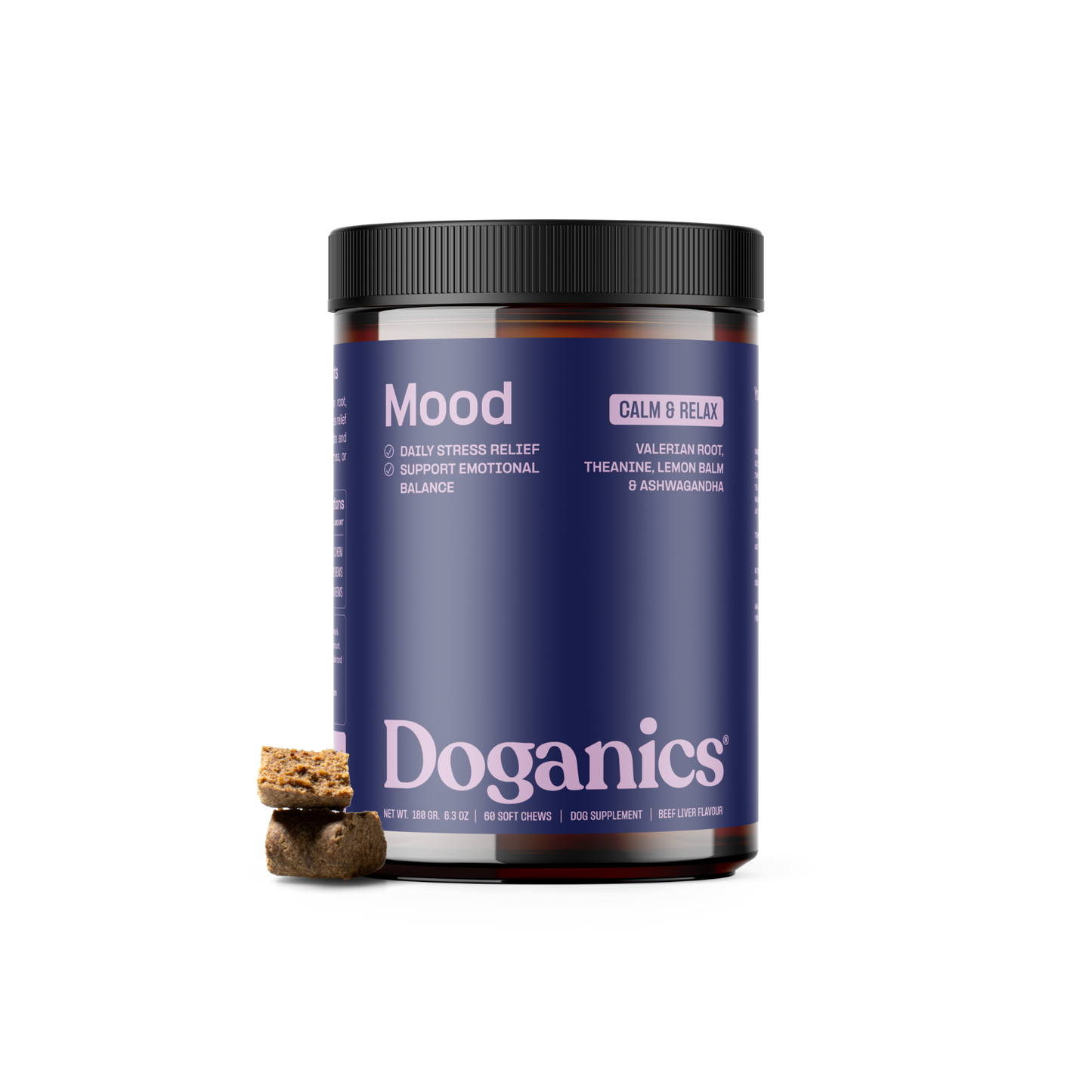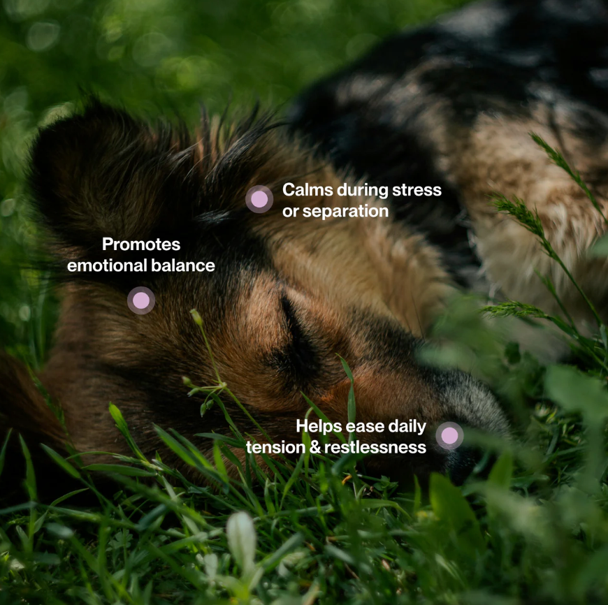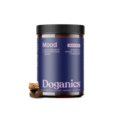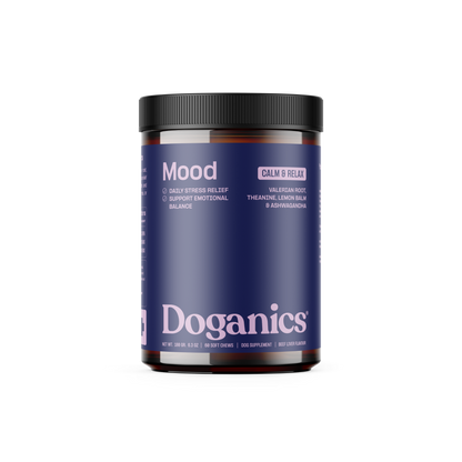 Doganics® Mood est un mélange calmant de racine de valériane, de L-tryptophane, de mélisse et de magnésium qui favorise le soulagement du stress et un comportement équilibré. Avec l'ashwagandha adaptogène et l'extrait de thé vert, il aide à apaiser la tension quotidienne, le stress des voyages ou l'anxiété de séparation.
