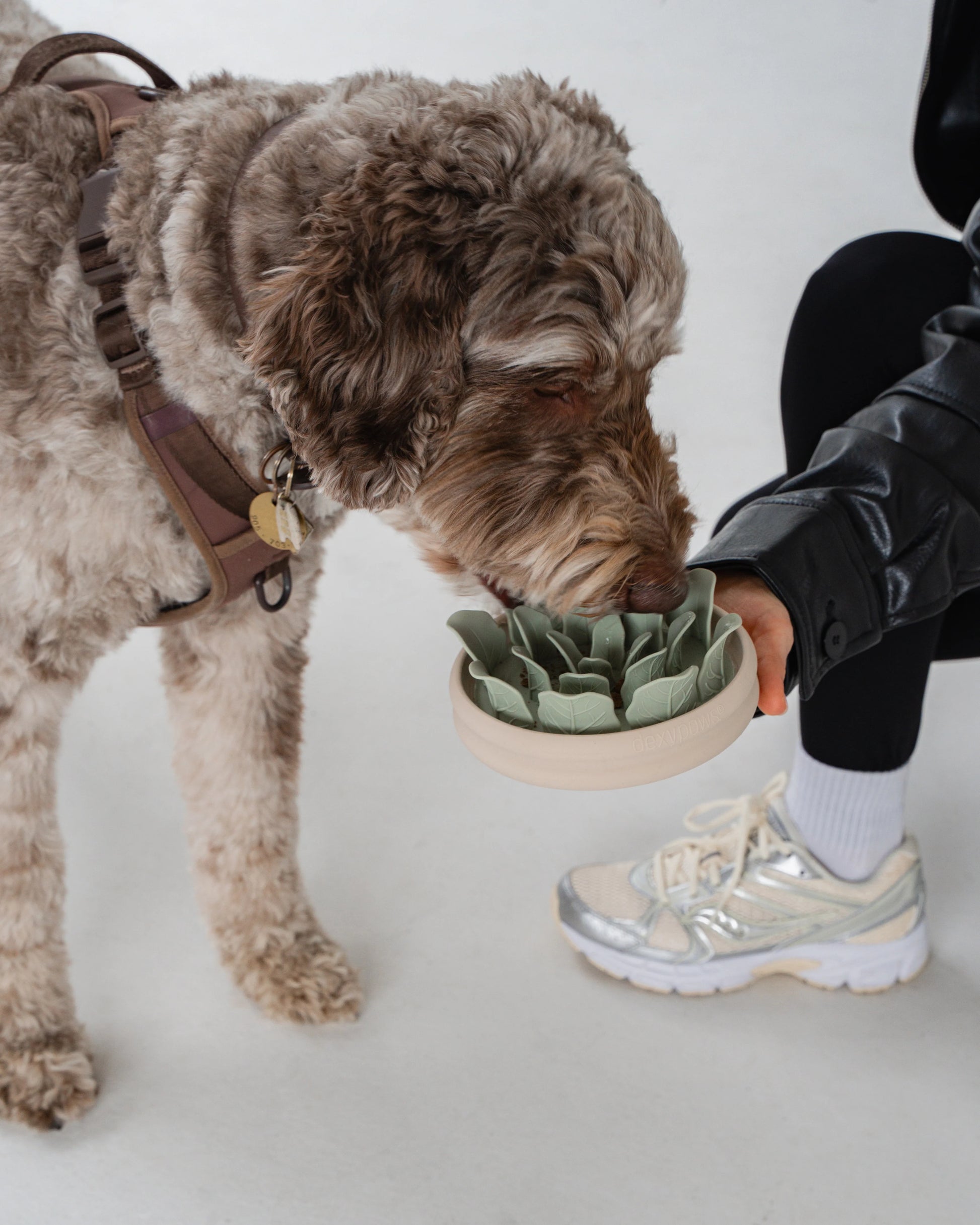 Les reliefs inspirées d'une feuille de salade sont souples, et permettent à tous types de chiens/chats de chercher, renifler, trouver ses croquettes dans la gamelle.