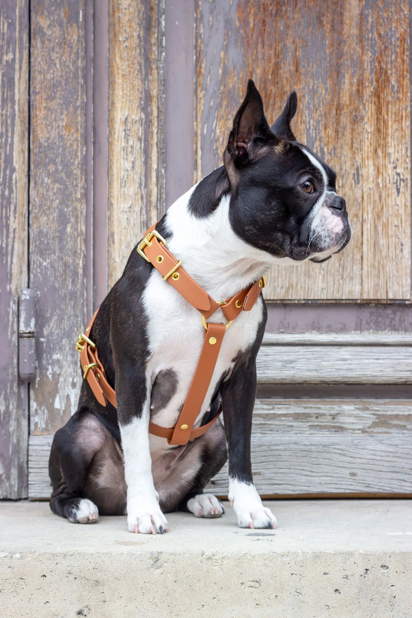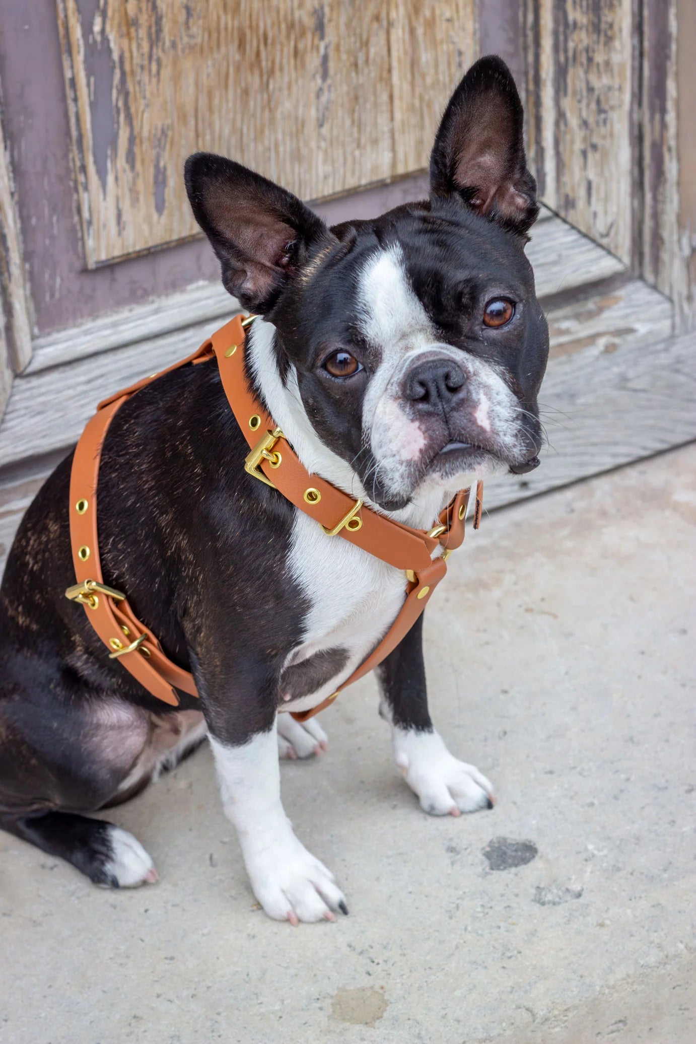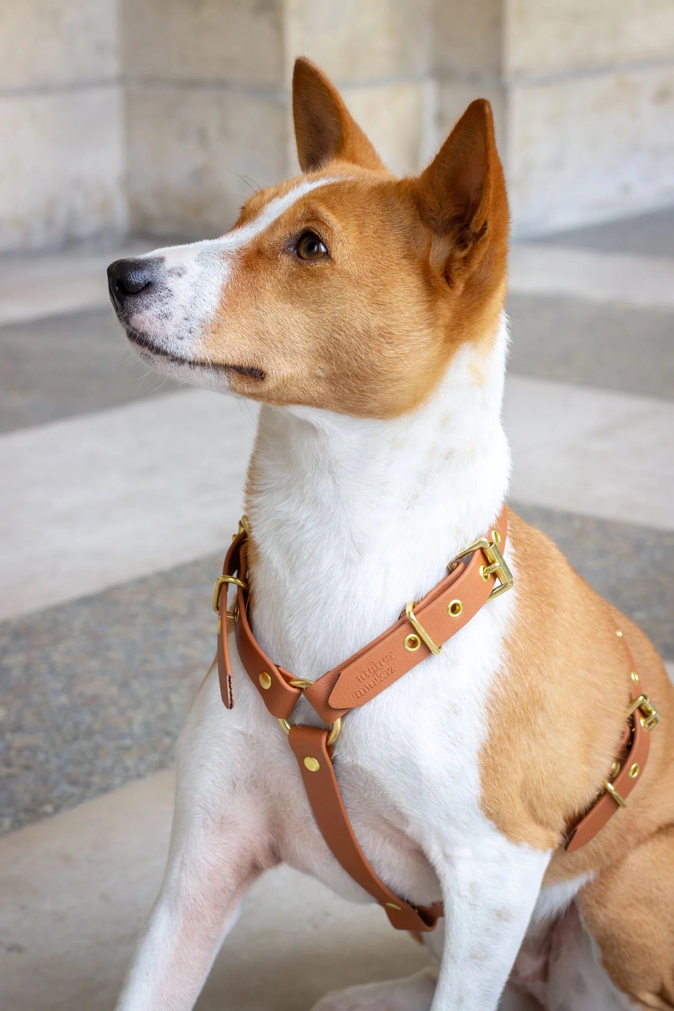Harnais pour chien en Biothane® camel avec une bouclerie en laiton massif. Ce harnais est idéal pour les chiens qui aiment se salir, se baigner ou sauter dans les flaques de boue car il est waterproof et ultra résistant. C'est le harnais tous terrains qui traversera les années avec votre chien. Fabriqué à la main à Paris.