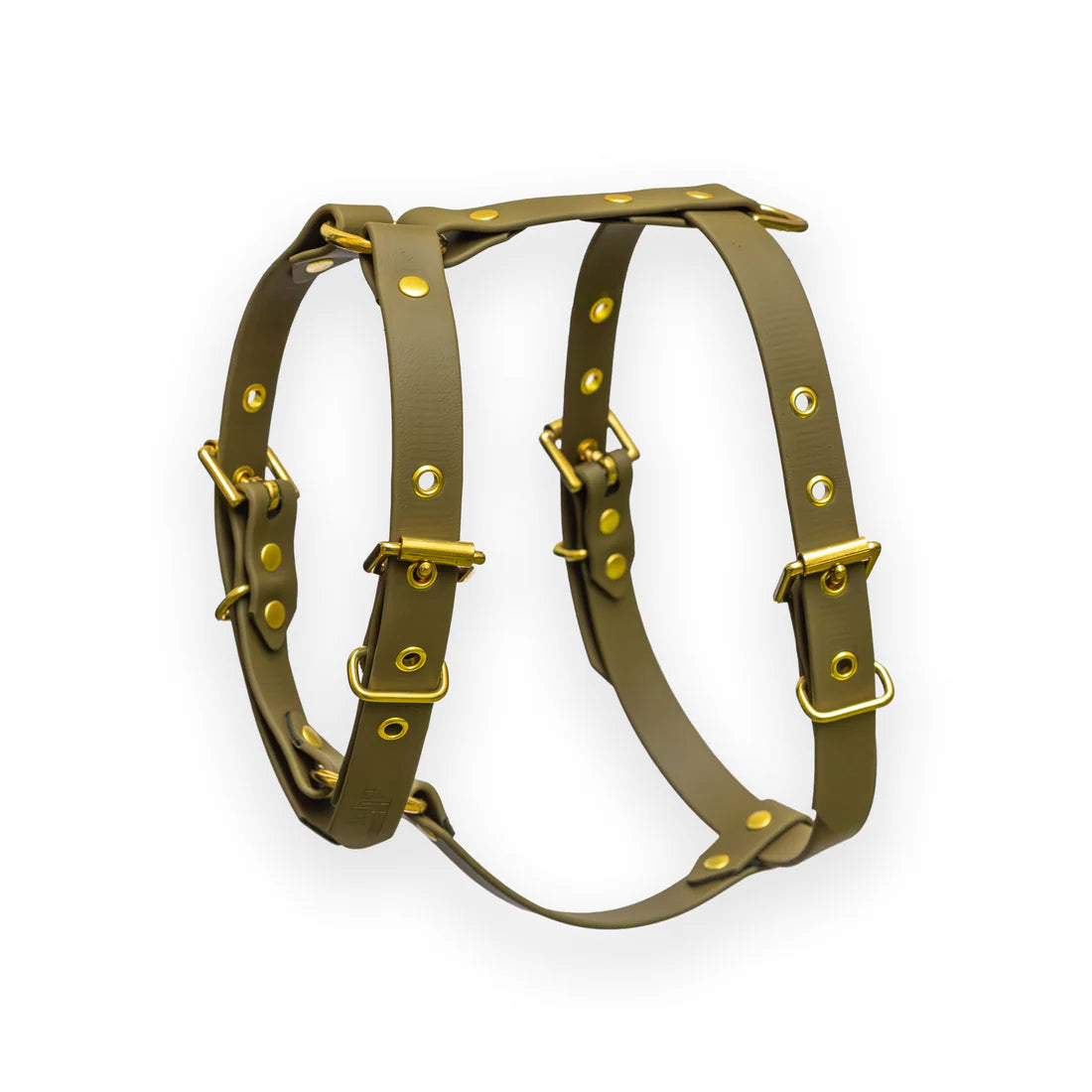 Harnais pour chien en Biothane® vert kaki avec une bouclerie en laiton massif. Ce harnais est idéal pour les chiens qui aiment se salir, se baigner ou sauter dans les flaques de boue car il est waterproof et ultra résistant. C'est le harnais tous terrains qui traversera les années avec votre chien. Fabriqué à la main à Paris.
