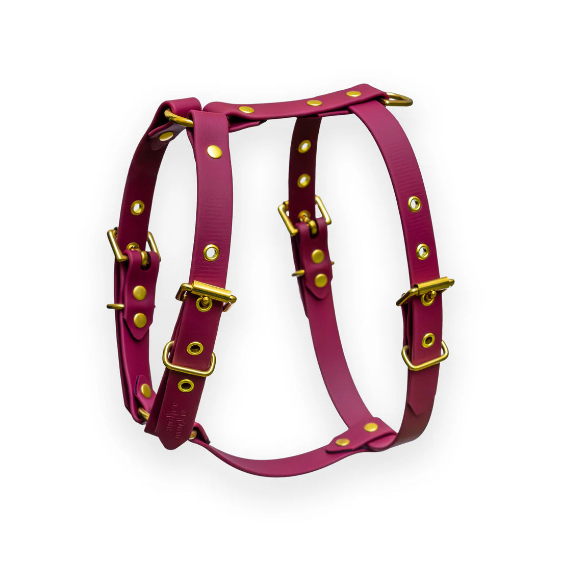 Harnais pour chien en Biothane® sangria avec une bouclerie en laiton massif. Ce harnais est idéal pour les chiens qui aiment se salir, se baigner ou sauter dans les flaques de boue car il est waterproof et ultra résistant. C'est le harnais tous terrains qui traversera les années avec votre chien. Fabriqué à la main à Paris.