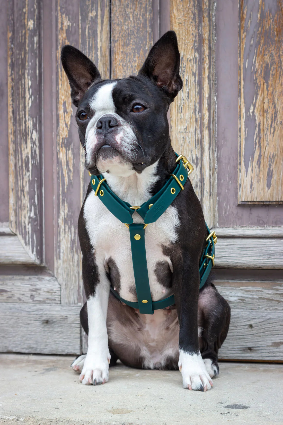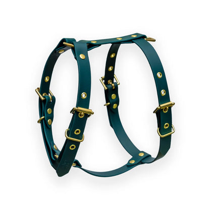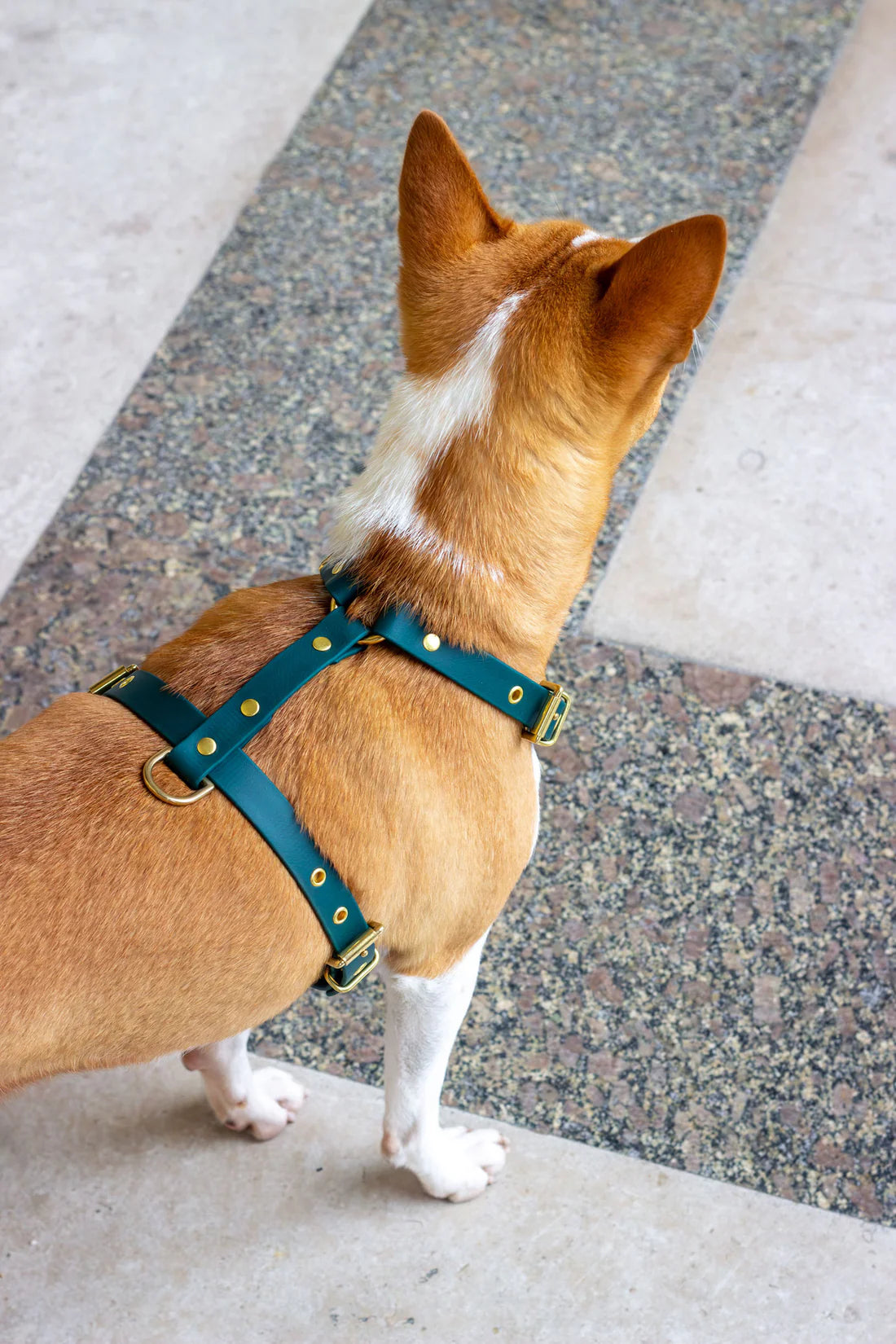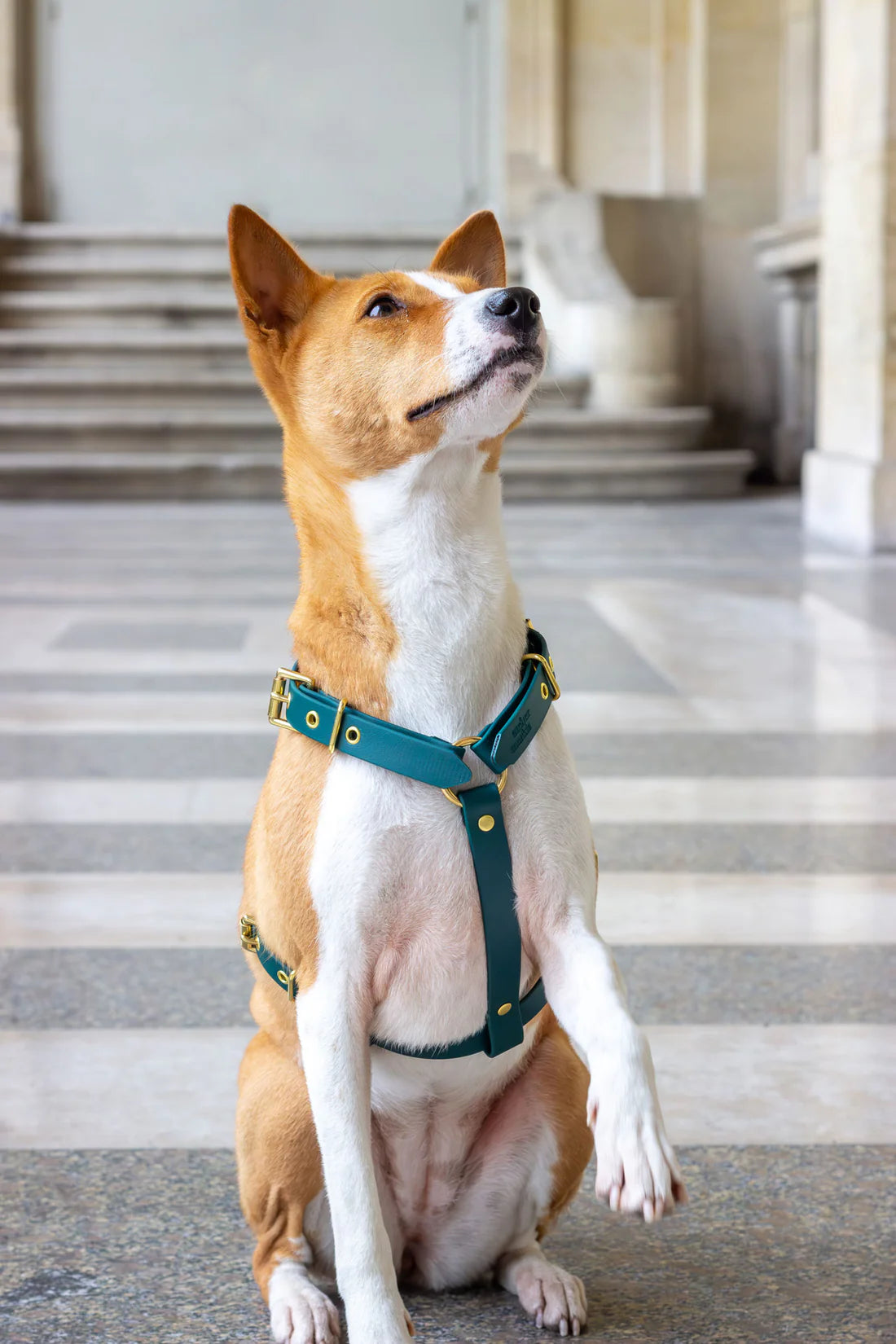 Harnais pour chien en Biothane® vert avec une bouclerie en laiton massif. Ce harnais est idéal pour les chiens qui aiment se salir, se baigner ou sauter dans les flaques de boue car il est waterproof et ultra résistant. C'est le harnais tous terrains qui traversera les années avec votre chien. Fabriqué à la main à Paris.