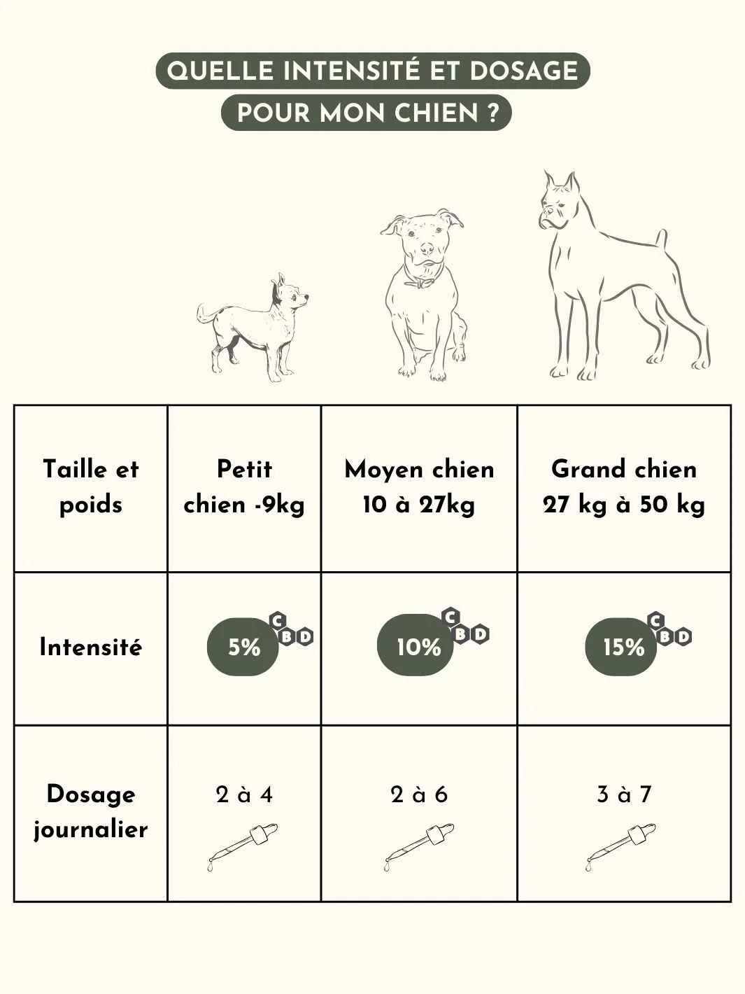 - Pour un stress ponctuel : en vu d'un événement anxiogène pour votre chien (stress dû à votre absence, trajet en voiture, feu d'artifice etc.), vous pouvez réalisez une cure d'une semaine, en donnant l'huile de CBD trois fois par jour, en commençant trois jours avant l'évènement. En fonction des résultats, vous pourrez ajuster le dosage.