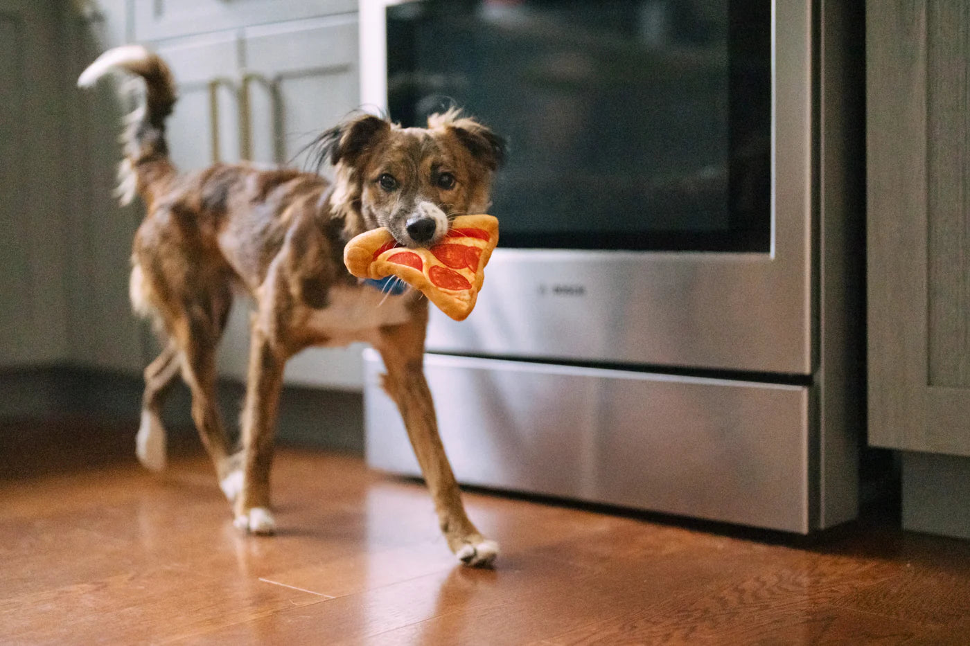Un jouet peluche en forme de pizza conçu pour divertir et stimuler votre chien. Avec ses textures différentes et ses nombreux bruits, il sera apprécié des chiens les plus gourmands et curieux ! La pizza contient 3 couineurs à l'intérieur et une corde solide au niveau de la croûte de la pizza, qui lui permet d'être machouillée sans crainte.