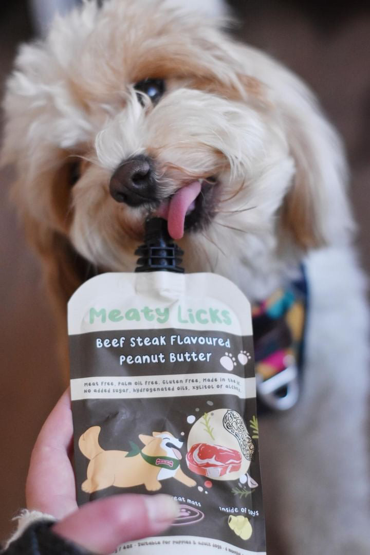 Le meaty licks est une petite gourde pour chien qui contient du beurre de cacahuète aromatisé au bœuf. Cette friandise est idéale pour récompenser ton chien lors de promenades ou de séances d’éducation. Elle peut également être utilisé sur des tapis de léchage ou dans des jouets à fourrer.