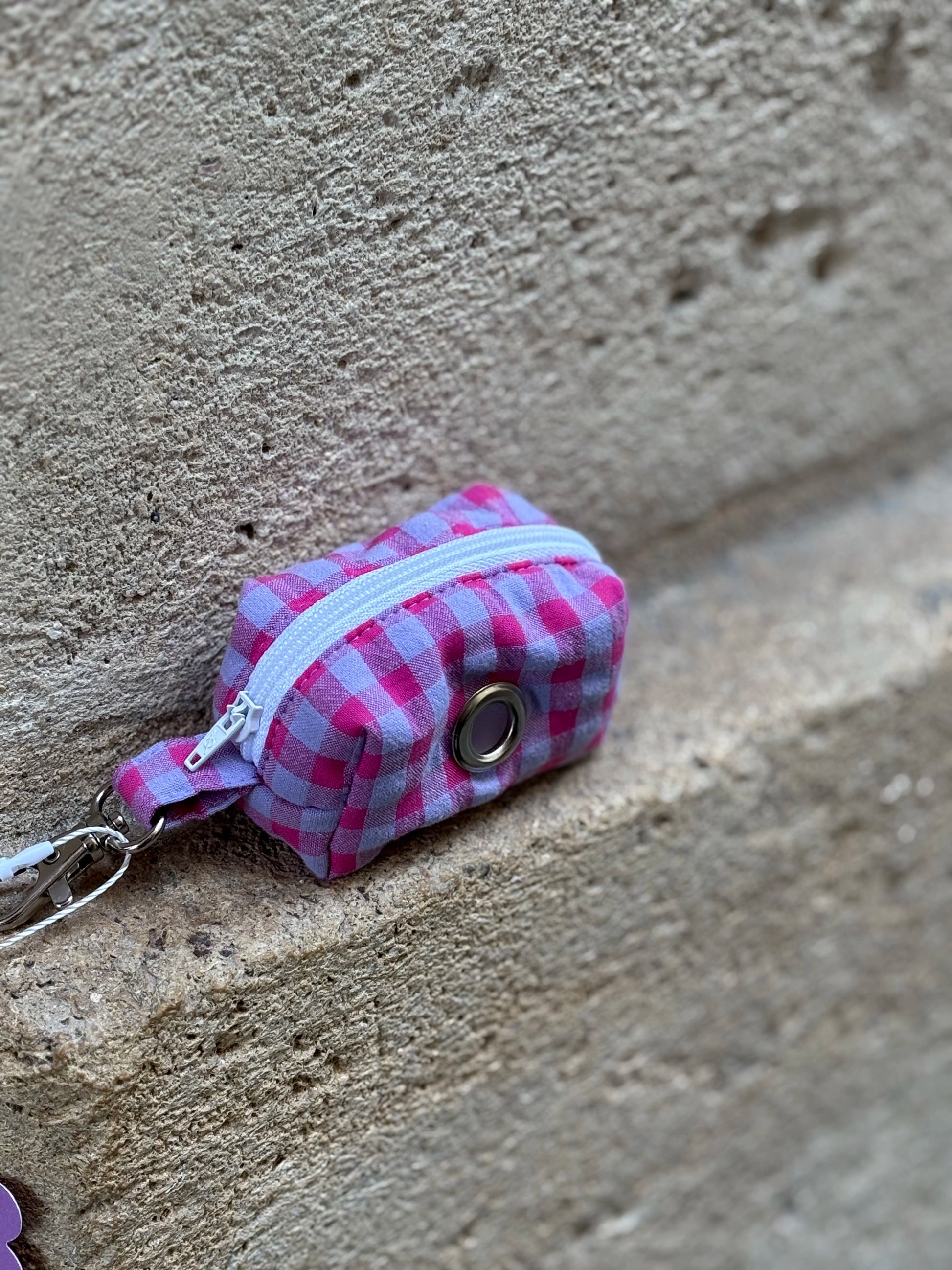 Distributeur de sacs à déjections vichy rose et lila avec empiècements argent. Chaque sac dispose d'un mousqueton afin de l'accrocher facilement à votre laisse, ainsi que d'une ouverture à zip pour y glisser vos rouleaux.