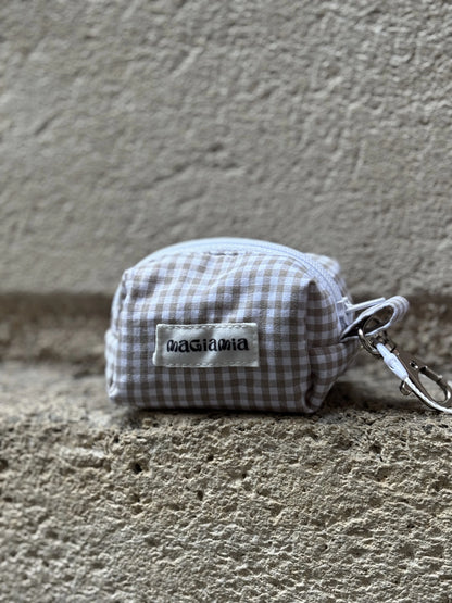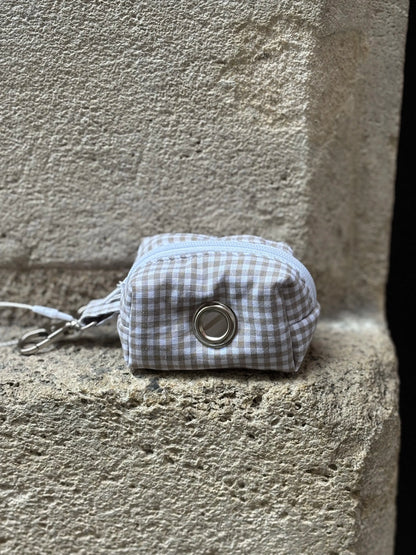 Distributeur de sacs à déjections en coton vichy beige avec empiècements argent. Chaque sac dispose d'un mousqueton afin de l'accrocher facilement à votre laisse, ainsi que d'une ouverture à zip pour y glisser vos rouleaux.