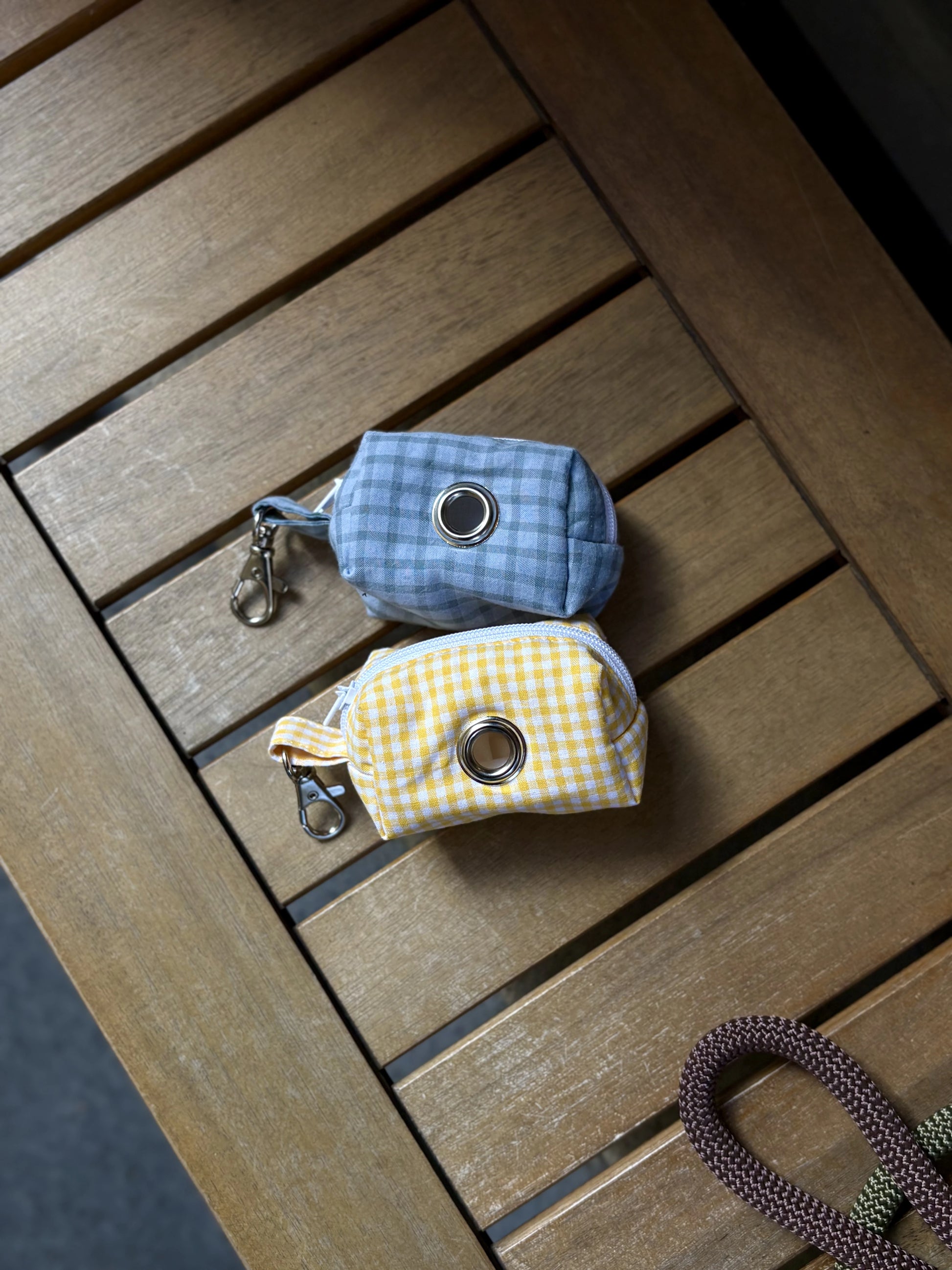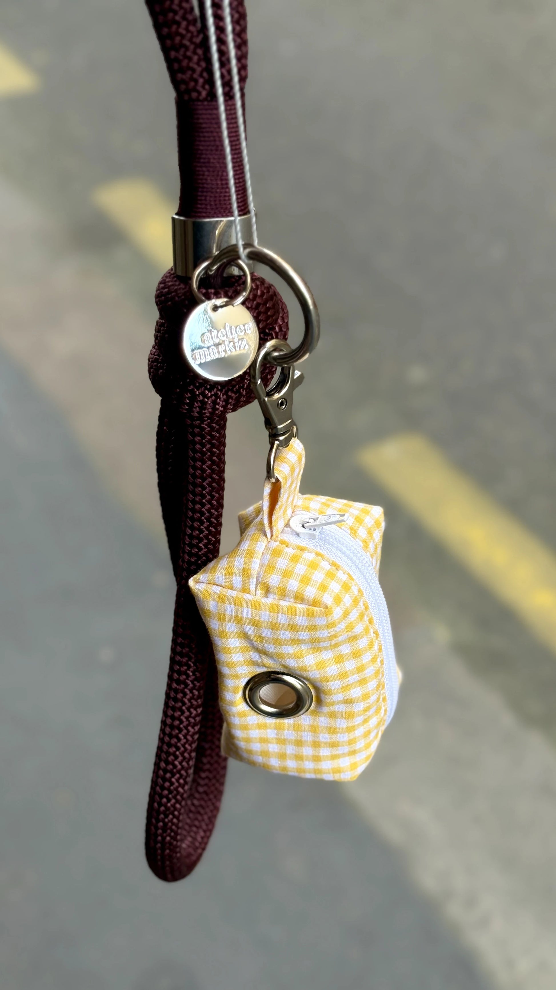 Distributeur de sacs à déjections en coton vichy jaune avec empiècements argent. Chaque sac dispose d'un mousqueton afin de l'accrocher facilement à votre laisse, ainsi que d'une ouverture à zip pour y glisser vos rouleaux.