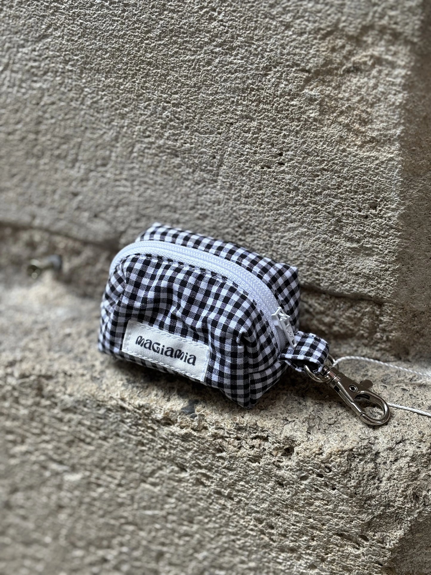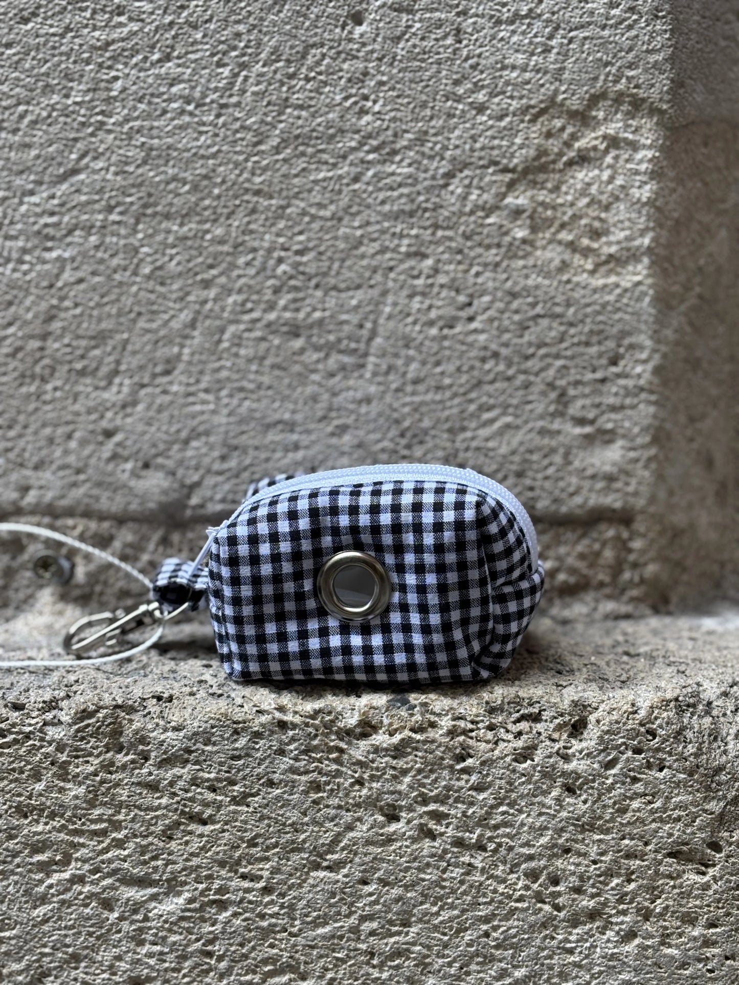 Distributeur de sacs à déjections en coton vichy noir et blanc avec empiècements argent. Chaque sac dispose d'un mousqueton afin de l'accrocher facilement à votre laisse, ainsi que d'une ouverture à zip pour y glisser vos rouleaux.