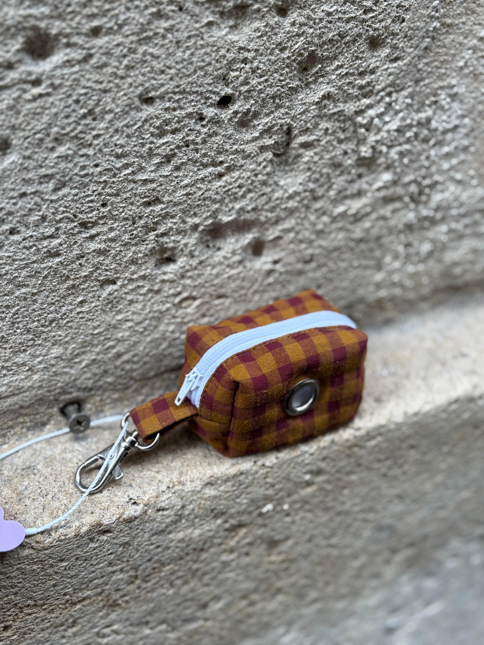 Distributeur de sacs à déjections en coton vichy ocre et bordeaux avec empiècements argent. Chaque sac dispose d'un mousqueton afin de l'accrocher facilement à votre laisse, ainsi que d'une ouverture à zip pour y glisser vos rouleaux.